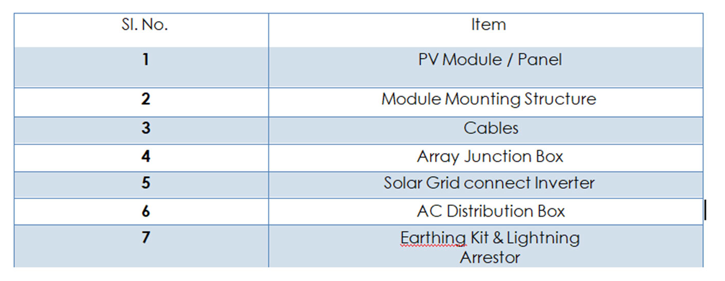 The whole system comprises of Solar PV Modules, Solar Inverter, Module Mounting Structures (MMS), Lightning and Over Voltage Protection system, Earthing Protection amongst other vital components. The individual components descriptions are explained later in the next section.
