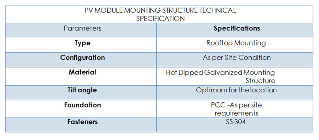 - Structures will be made of galvanized mild steel/ aluminum based on site soil and wind load parameter Suitable number of Array frames will be provided based on the design and site