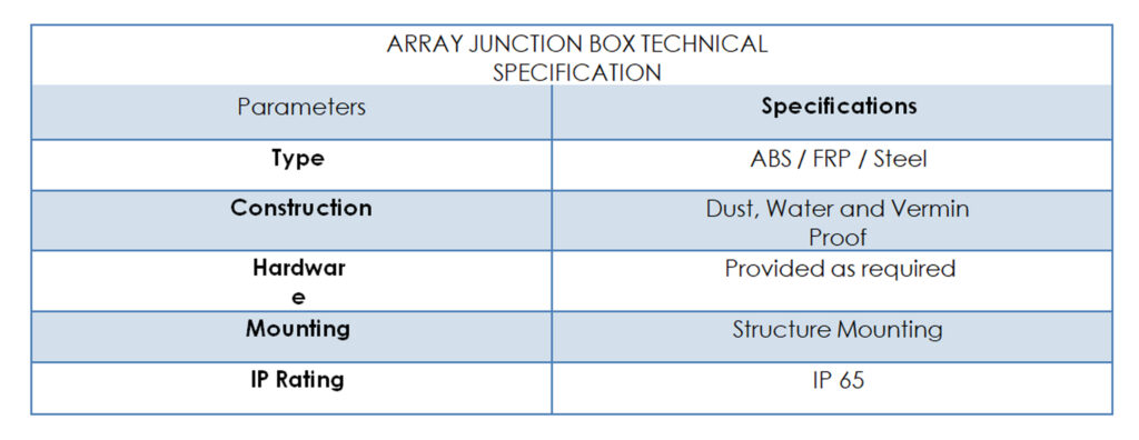 The junction boxes will be mounted on pole of array support structures. It will have proper locking mechanisms. Suitable marking will be provided on the lugs for easy identification. The junction boxes will have suitable cable entry points fitted with the cable glands. AJB is provided to combine the string form PV array. The AJB will have MOV and Fuse for protections propose. The AJB will be made of non-metallic enclosure with IP 65 outdoor rating.